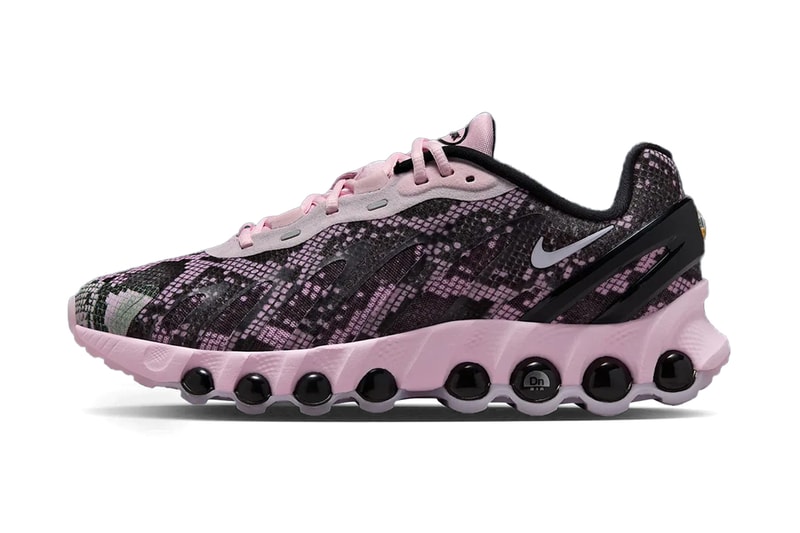 Adding to the Nike Air Max Dn8 lineup is the “Pink Snakeskin” colorway. The model released in previous snake-inspired patterns and this particular pair extends the motifs with its sleek, scale-printed upper laid on a rich pink and black tone. The shoe’s soft pink foam overlay hits the tongue and eyestays as well as the midsole. Sitting atop the Dynamic Air system that includes eight separate pods, gives the shoe added cushioning from heel to toe. Additional reflective details are seen on the Swoosh and tongue for added detailing. Look out for the pair set to arrive this summer.