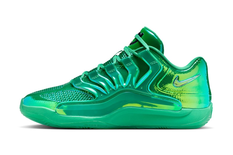 Central to the design is a metallic lace jewel sculpted in the image of a scythe, a direct nod to Durant’s “Slim Reaper” persona. This metallic pop provides a sharp counterpoint to the matte and gloss textures of the Stadium Green build. To further signal the limited nature of this release, Nike has opted for high-tier packaging, replacing the standard shoebox with a custom-molded hard case. This structural presentation ensures that the KD 18 is treated as a piece of curated gear rather than a routine performance sneaker.